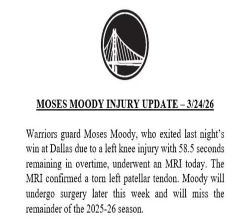 北京时间3月25日,据名记Shams报道,ESPN消息源透露,金州勇士后卫穆迪确诊为左膝髌腱撕裂。穆迪这个生涯最佳赛季就此报销,他将需要进行漫长的康复治疗。随后,勇士官方宣布了这一消息,并表示穆迪将在本周晚些时候接受手术。名记Siegel表示,穆迪预计还将缺席2026-27赛季大部分比赛。