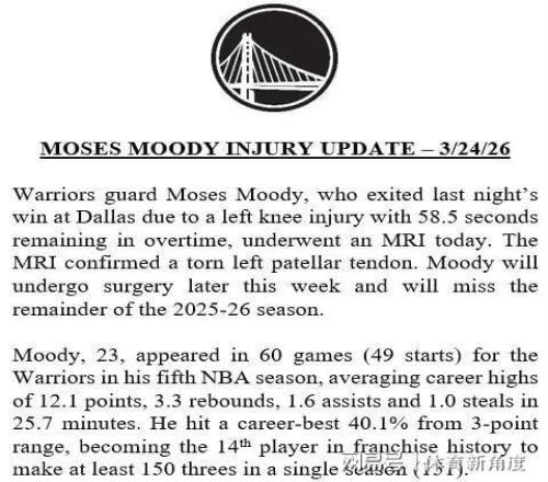 最坏的情况已然发生,虽在预料之中,但仍令人惋惜。据知名体育记者Shams披露,穆迪不幸遭遇左膝髌腱撕裂,将提前结束本赛季的所有赛程。另一位资深记者Siegel进一步补充称,预计穆迪还将缺席2026-2027赛季的大部分比赛。随后,勇士队官方发布声明,确认了这一消息的真实性。