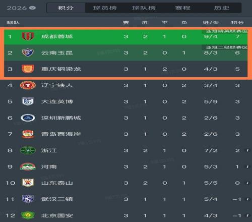 第一个,西南足球彻底崛起了,3轮后暂列中超前三名,成都7分排第一,云南6分排第二,重庆5分排第三。本轮最大惊喜也是这3队,云南玉昆4比0狂胜山东泰山,爆出最大冷门,而重庆铜梁龙与成都蓉城的川渝德比更是打成3比3平,也是最精彩的一场,西南足球新赛季太强了。